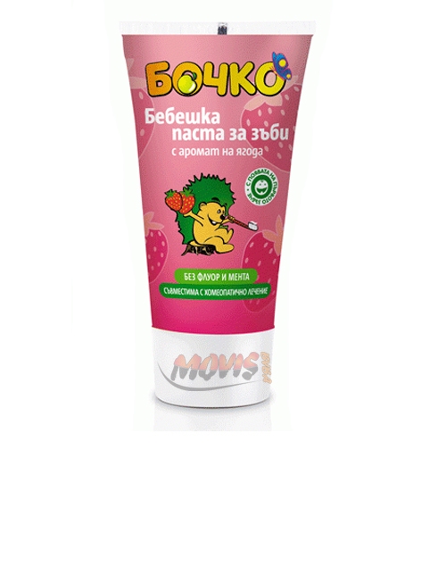 Category:Children Care ( БОЧКО бебешка и детска козметика )Packing:50ml. This special formula with low abrasiveness cleans teeth and prevents the development of bacteria responsible of caries formation. Natural ingredients strengthen the enamel of the milk teeth and protect the gums from inflammation. Due to the fact that the toothpaste does not contain Fluor, it is harmless if swallowed. It doesn’t contain preservatives and colorants. Light fruit flavour makes it easier to teach your child to take regular care of the oral hygiene. This baby toothpaste can be used along with homeopathic medicines, because it doesn’t contain Mint and Fluor.