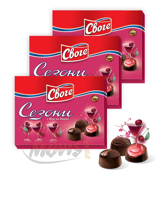 Category:Sweets ( Бонбони )Packing:160on Sweet intoxication of Svoge real dark chocolate , soft cream - flavored liqueur and sour cherry liqueur.