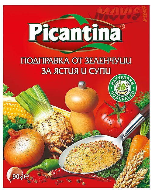 Category:Spices ( Бульони и универсални )Packing:90on Picantina Classic Seasoning is a universal seasoning containing parsley, carrots, onions, celery, turmeric etc. that easily and quickly enhances the taste of meat, fish, soups and salads.
