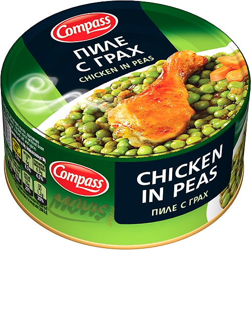 Category:Canned Food ( Готвени ястия )Packing:1issue. The delicate taste of chicken meat in green peas, flavoured with tomatoes, onions and spices will carry you away.