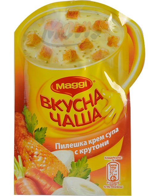 Category:Spices ( Супи )Packing:16on Your favorite well-known chicken taste and savoury vegetables are mixed in a cup of chicken cream soup with additional crunchy croutons. The only thing you need to do is to add boiled water and enjoy your meal.