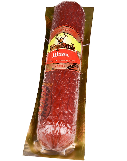 Category:Meat Products ( Трайни колбаси )Packing:300on Larded sausage Perelik is dried according to an old family recipe and smoked on beech wood.