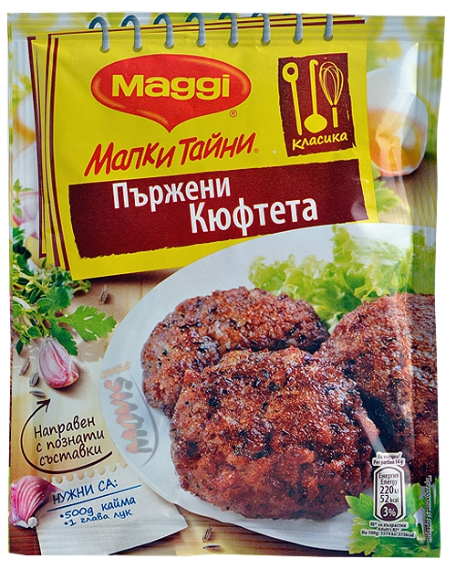 Category:Spices ( Фиксове )Packing:57on If you want to cook your favorite fried meatballs in no time, just place the content of Maggi Fix Little Secrets in 100ml of cold water and leave for 5 minutes. Add 500g mince, 1 onion and 100g flour or breadcrumbs. Shape in oval ball forms, fry the meatballs and you are ready.
