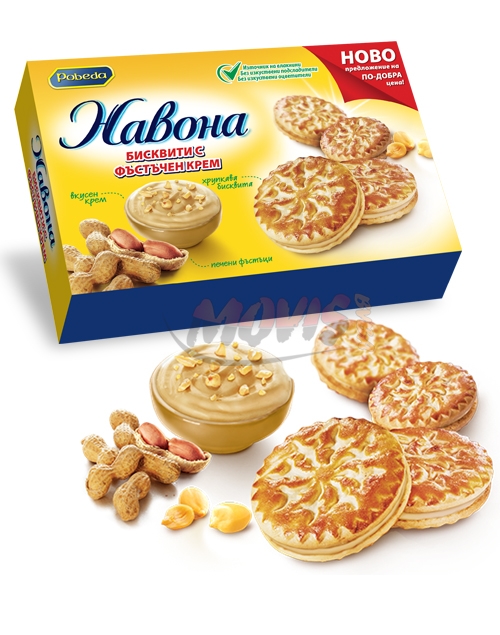 Sandwich biscuits rich in peanut cream in the middle containing aromatic roasted peanuts. Navona sandwich biscuits are the second best-selling sandwich biscuits on the Bulgarian market. They are made of two biscuits sandwiched with peanut or cocoa cream. They look attractive - with a golden colour and a distinctive engraving depicting a sun. The product has been present for long on the Bulgarian market and enjoyed a permanently strong interest.